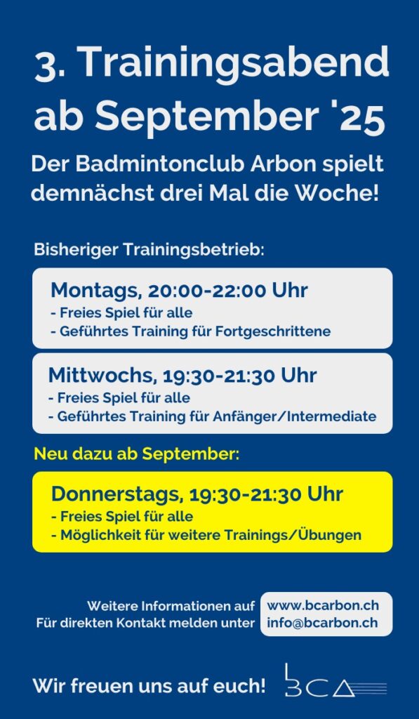 | Der BCA bietet für Turnier- sowie auch für Plauschspieler/innen zweimal wöchentlich Training an. Unsere Junioren werden immer Montags trainiert. Zudem spielen in der Saison 25/26 drei Interclubmannschaften in der 3. und 4. Liga mit. Gerne begrüssen wir auch Dich bei einem Probetraining! Kontakt: info@bcarbon.ch Neu ab September: